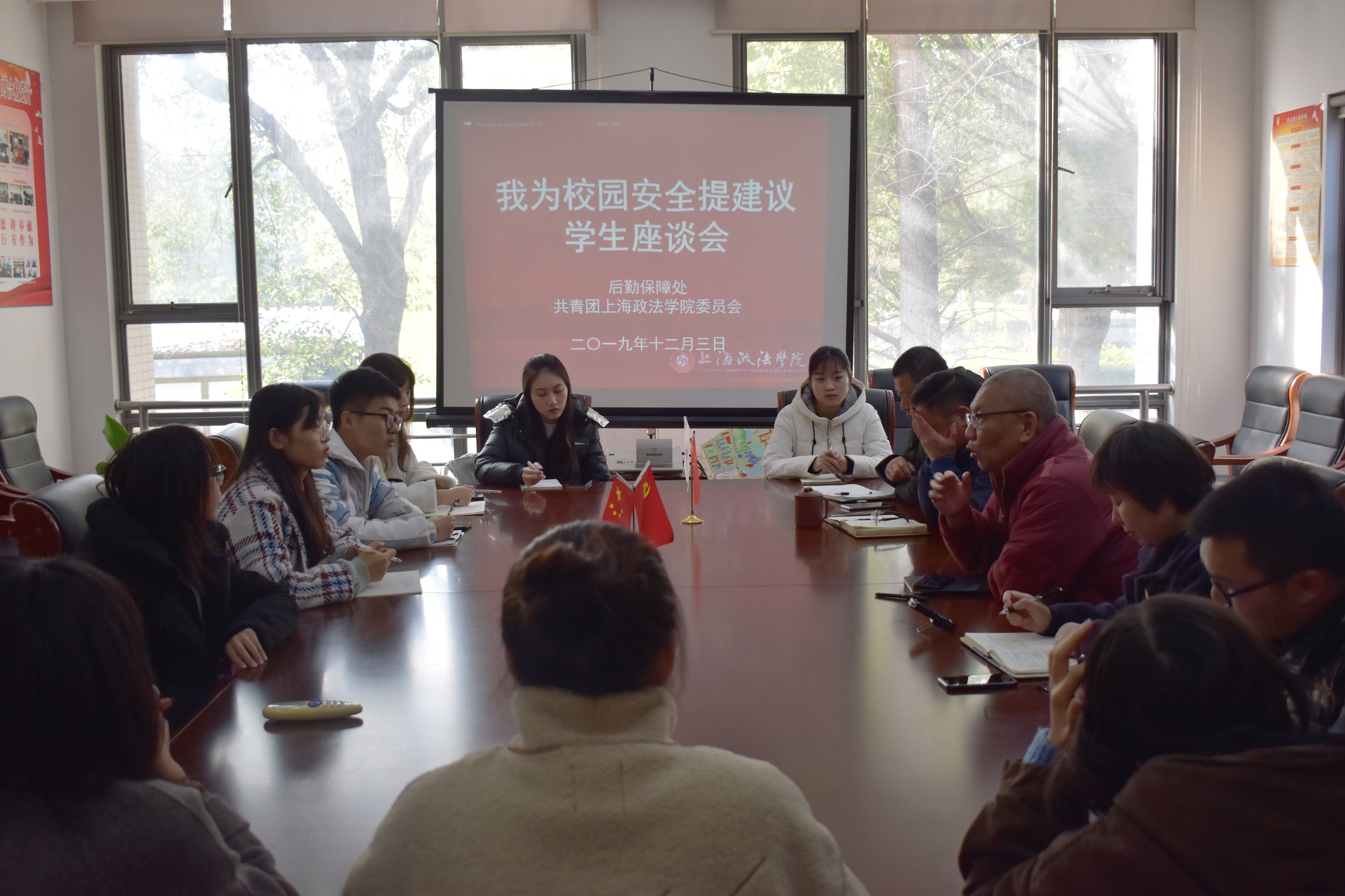 为进一步加强学校安全生产的各项工作,通过学生的反馈和建议来解决校园安全存在的问题和隐患,加强后勤部门与学生之间的的沟通交流,提高后勤保障能力和服务水平,确保校园安全。2019年12月3日下午,后勤保障处在行政楼117会议室开展了“我为校园安全提建议”学生座谈会。后勤保障处副处长祝耀明、物业科科长凌辉、综合服务科科长彭玲、上房物业经理盛一明出席座谈会,各二级学院、膳管会、校学生会权益部的学生代表共同参与了本次座谈会。