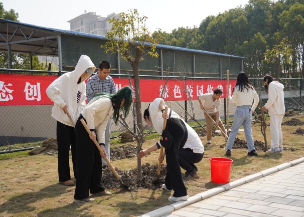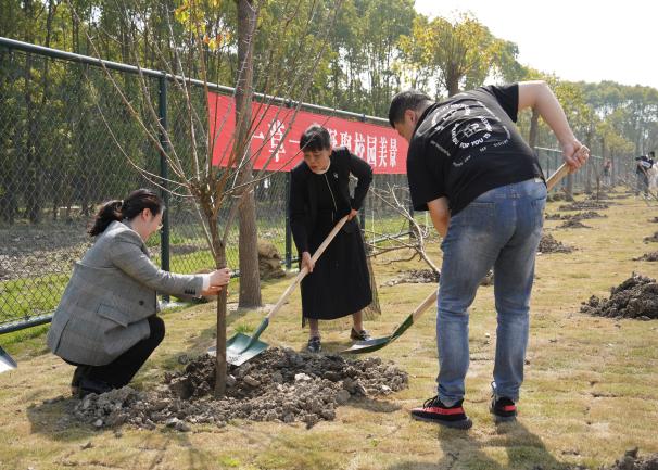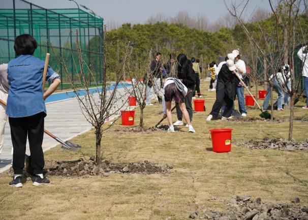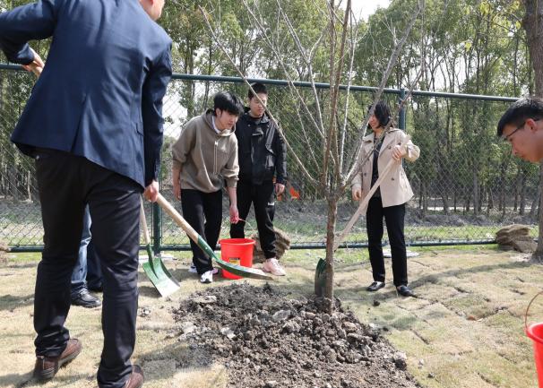 植树活动一开始,校领导就带领师生扛起铁锹,走向植树地点,和大家一起挥锹铲土、扶苗培土、围堰浇水,忙碌了起来。校领导一边劳动,一边同身边的师生交流加强生态保护、坚持绿色发展的看法,叮嘱大家养成爱护自然、保护环境的意识,用自己的双手把校园建设得更加美丽。经过一番热火朝天的劳动,35棵海棠树苗、35棵红梅树苗迎风而立,枝头花苞已经吐露,将绿地装点得生机盎然。部分树苗即将迎来盛花期,将为广大师生创造更加优美、舒适的工作和学习环境。