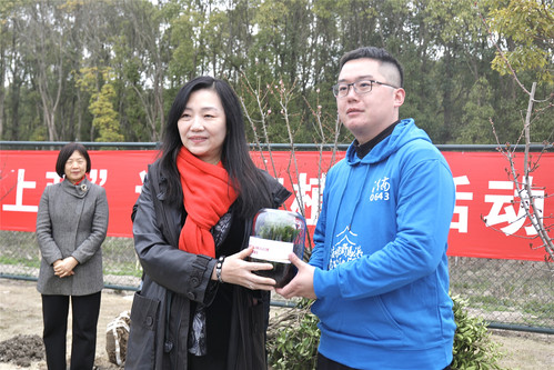 校党委副书记、校长刘晓红为校友代表李想颁发此次认捐树木的捐赠证书;李想代表原国际法商系0643班向母校敬送了一棵满载校友之爱的“青春之树”,祝福母校事业蒸蒸日上,也致敬他们在野马浜度过的美好青春年华。