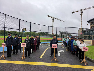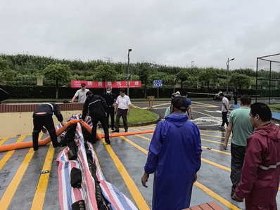 防汛防台应急演练阶段,模拟了强台风和暴雨来袭,校园地下人防场所出现积水、下水管道设施清淤疏通、校园树木加固防倒等紧急情况。接巡查组报告后,防汛防台应急小组立即启动预案。保洁组、排水组、警戒组等各应急处置小组第一时间赶赴现场。各小组各司其职运送沙袋封堵进水口,防止积水流进低凹处;水电工进行电力抢修和全面排查,保障学校电网安全稳定运行;保洁人员对下水道、排水沟等进行清理;排水组及时铺设排水管启动应急排水泵,确保排水通畅。