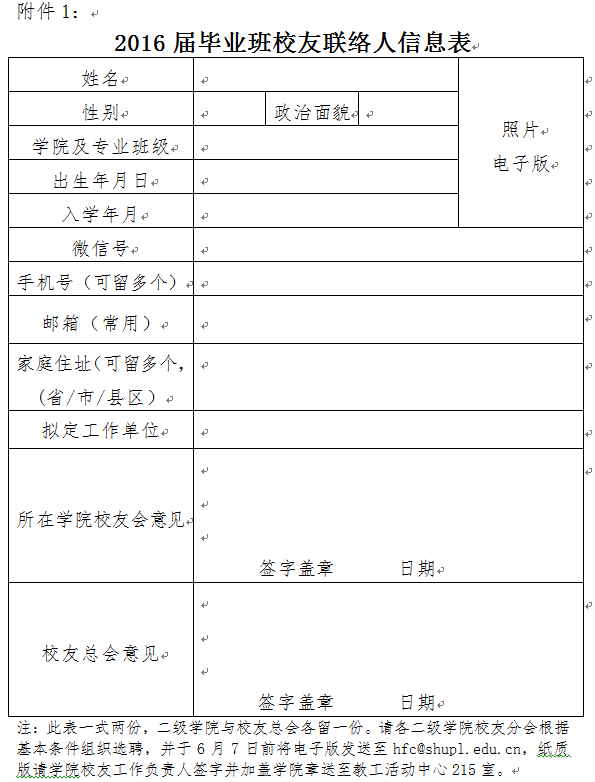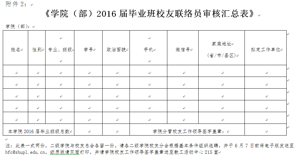 1.请各二级学院校友分会根据基本条件组织选聘,并于6月7日前将附件电子版发送至hfc@shupl.edu.cn,纸质版请学院校友工作负责人签字并加盖学院章送至教工活动中心215室;
