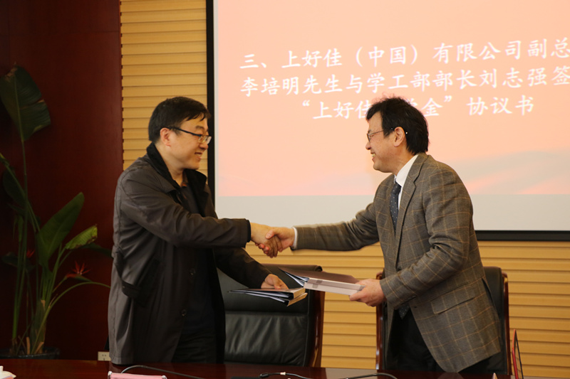 随后,公司副总裁李培明先生与学工部部长刘志强签订“上好佳奖学金”协议书,并由施学理董事长与青浦区政协董永元副主席为获奖学生颁奖。