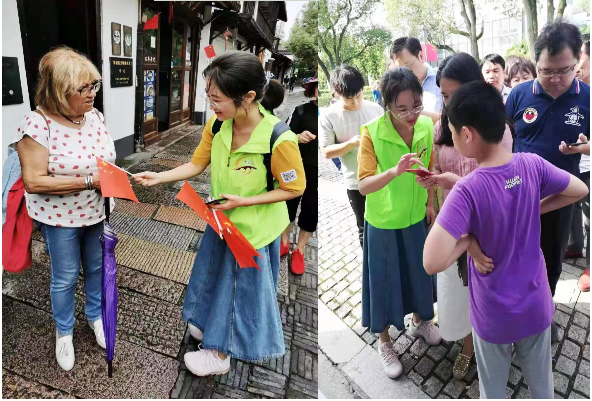 文化服务也是新利18官方客服师生党员服务的重要内容,展现师生以知识服务社会,真诚奉献社会的精神和使命感。如10月22日,语言文化学院党总支组织党员教师赴朱家角古镇开展“啄木鸟”语言文字服务活动,有针对性地对景区街道的路牌、标识等语言文字进行检查,对不规范的外语翻译、汉语文字表述用手机拍照,以便回去后整理、纠错。10月24日,法律学院青芒志愿者巴金故居分队组织学校志愿者前往位于徐汇区武康路113号的巴金故居进行志愿活动,用耐心和责任心解决游客面临的问题,维持现场秩序,并讲解巴金故居历史故事。国庆假期期间,语言文化学院50名大学生志愿者,身穿绿马甲,奔走在古镇朱家角周边的18个服务点,为保持景区旅游的文明和谐、为增强国内外游客的便捷体验奉献爱心。从早上8:30到下午4:30,在长达8个小时的服务过程中,他们用温暖亲切的笑容,专业的英语交流能力,身体力行诠释了“奉献、友爱、互助、进步”的志愿者精神。