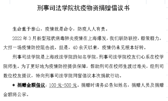 上下同欲为胜,同舟共济为赢。在整个上海市疫情到了最为吃紧的关键时刻,为更好地维护校园安全与稳定,学校特向全体校友和各界热心人士发出防控物资募捐的倡议。自4月9日学校发出倡议以来,刑事司法学院校友会积极响应,校友们群策群力,针对目前学校较为紧缺的N95口罩、防护服、消毒液等医用物资,积极想办法筹措资金,开辟采购渠道,同时向刑事司法学院校友发起抗疫物资捐赠倡议书,得到了多位校友的积极响应与支持。