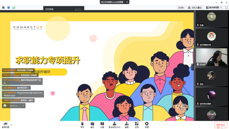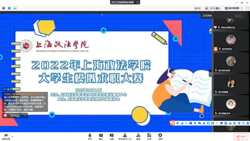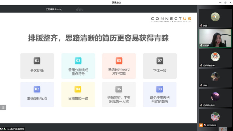 10月11日下午,我校通过腾讯会议启动2022年就业创业文化节系列活动之“秋招伴你行,求职技能大PK”新利18官方客服大学生模拟求职大赛专项培训计划。上政校友、CONNECTUS GROUP校园关系经理王雪吟以“简历制作”为主题,指导我校学生提升求职技巧,吸引了300余名学生参与,学生工作部学生就业服务中心张露主持活动。