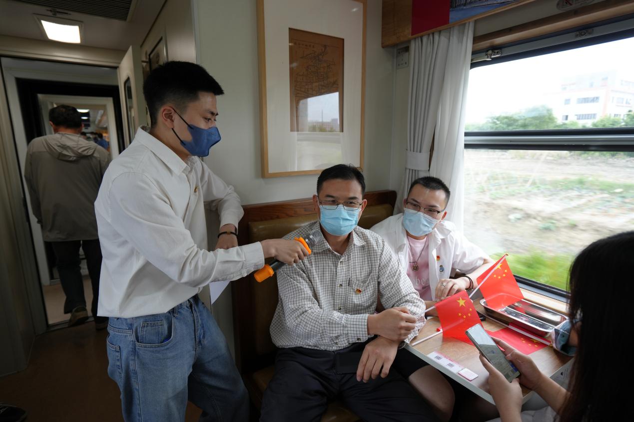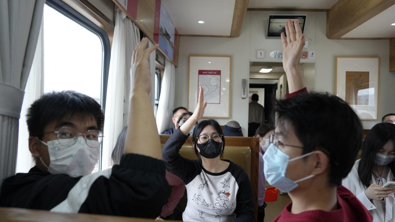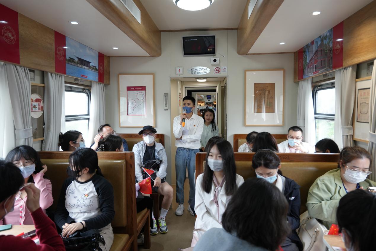列车上,解说员带领大家进行红色知识竞答、给党邮寄一张明信片等活动,让师生们穿越历史,沿着中国共产党人的足迹,重温初心,共同探寻共产党人的精神密码。师生们全神贯注、积极抢答,场面精彩纷呈,将活动氛围推向了高潮。