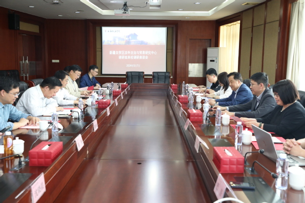近日,新疆自贸区涉外法治与贸易研究中心调研组一行来校调研座谈。校党委书记葛卫华,党委常委、副院长罗立刚出席座谈会并与调研组一行进行深入交流。座谈会由罗立刚主持。
