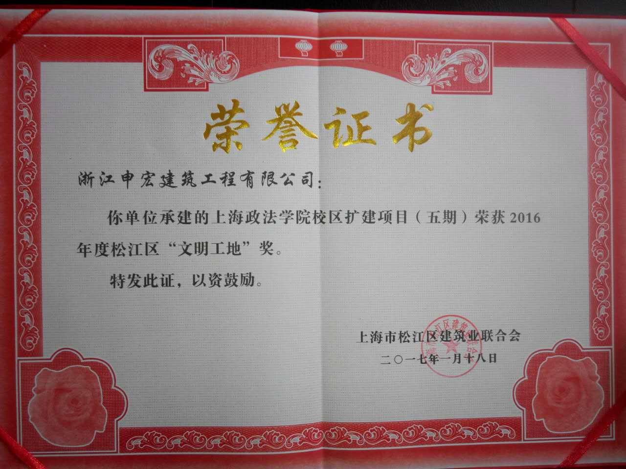 近日,松江区建筑业联合会沪松建联字〔2017〕第01号文公布了2016年下半年获松江区“文明工地”称号的项目名单,我校扩建五期项目名列其中。