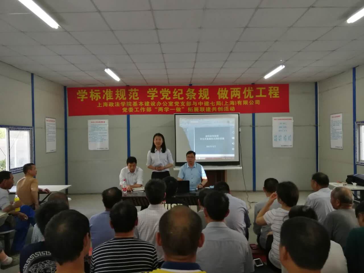 2017年5月10日晚上,基建办党支部与中建七局(上海)公司党委工作部在上合培训基地农民工夜校共同组织职工进行施工质量标准规范培训,基建办和项目部管理人员及部分职工代表参加培训,培训会由中建七局(上海)公司党委工作部部长刘旸主持。