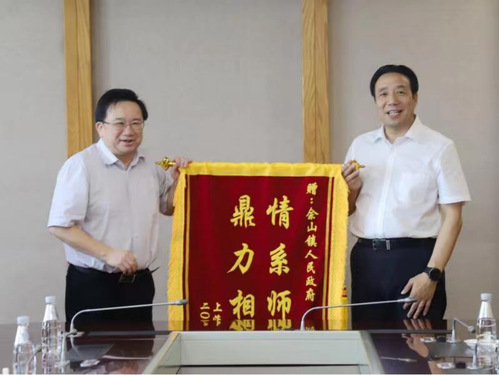 夏小和代表学校党政对今年7月下旬台风“烟花”来袭期间,佘山镇人民政府第一时间安排镇防汛办和水务站等专业人员解决校园积水问题表示衷心的感谢。他谈到,学校地处佘山镇,镇政府长期以来对学校的事业发展给予了很大的帮助,在本次台风“烟花”来袭期间,由于校园地势较低、河道水位较高,部分区域由于河水倒灌造成积水,学校在向镇政府提出援助请求后,镇领导亲自带队赴实地踏勘并立即安排防汛办组织专业人员、调配排水设备对校园积水严重区域进行应急排水,解决了学校的实际困难,为学校平稳度过汛期和平安校园建设提供了有力支撑。随后,夏小和代表学校向佘山镇人民政府赠送了锦旗,向参与排水的防汛办和水务站赠送了慰问品。