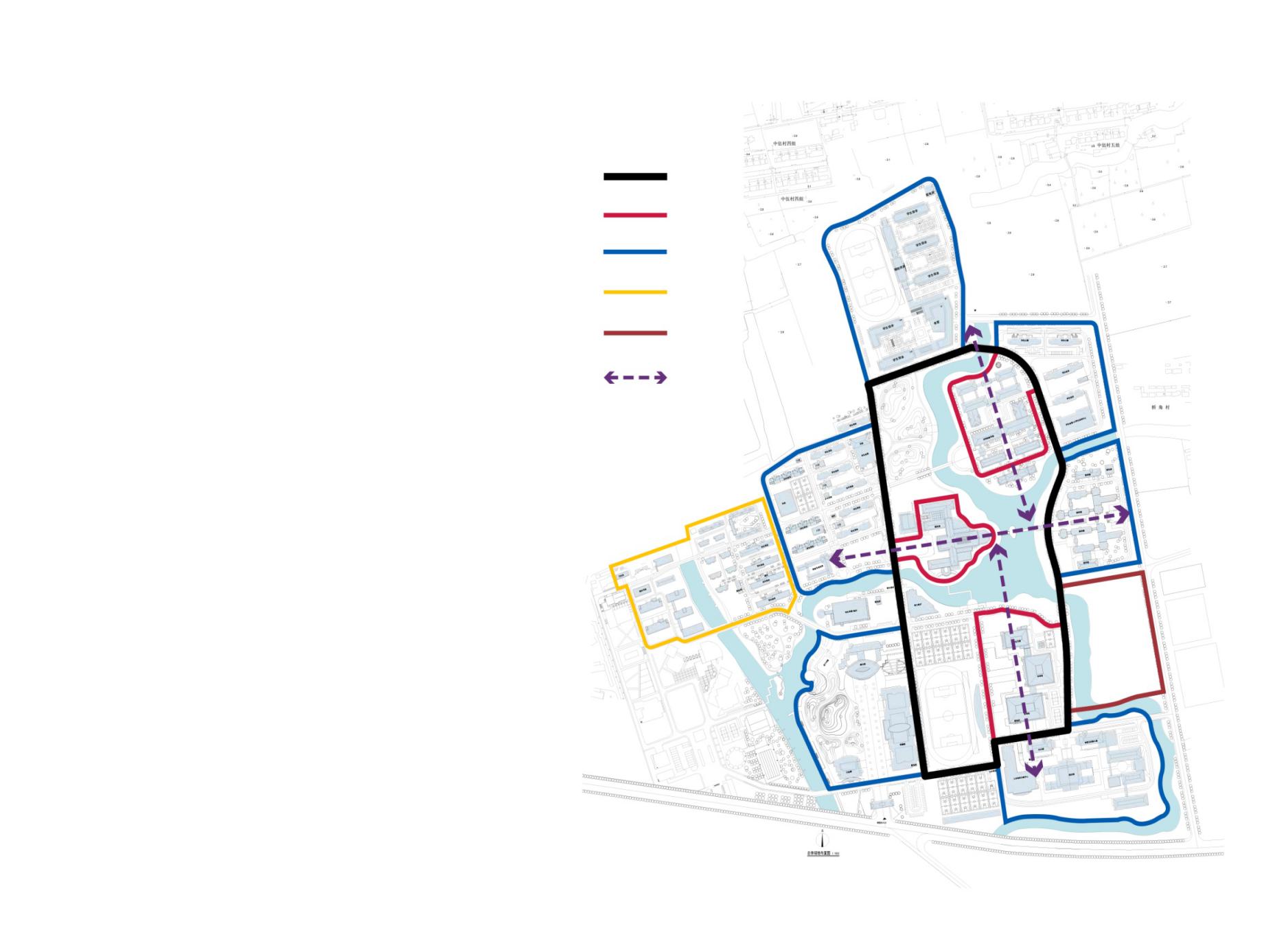 松江校区是在老校区基础上,十多年间自西向东、由南向北,由一块块用地不断扩建而来,因此,虽然每个局部地块规划完整清晰、水准较高,但一直存在着整体结构松散、逻辑性不强、风貌脱节的问题,道路系统也一直主次不够分明、整体感欠缺。因此,本次规划希望建构一个既契合这种发展模式、遵循原有空间轴线导向,又层次分明、逻辑清晰的规划结构和道路体系。