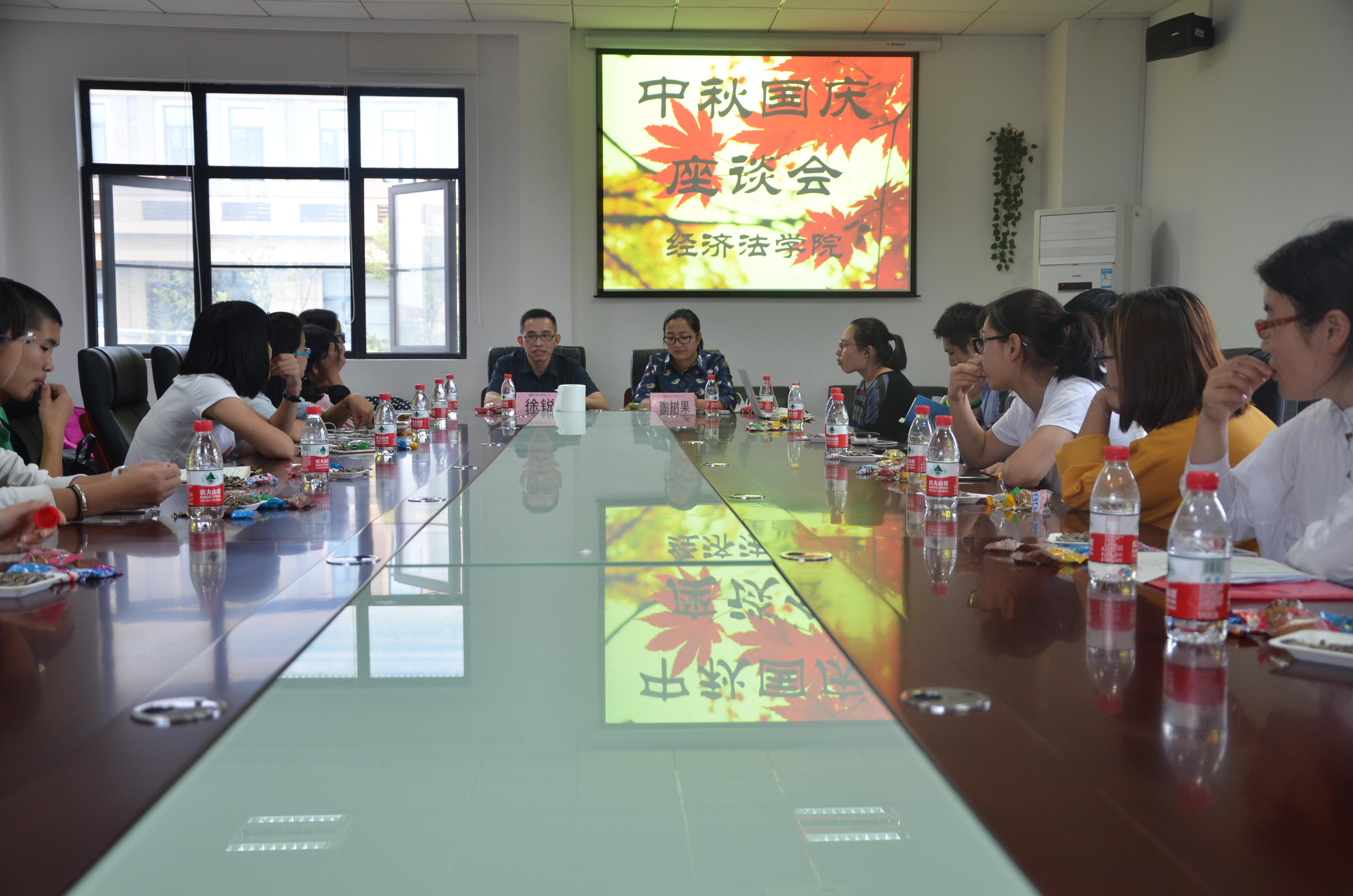 在中秋节与国庆节双双到来之际,为了给同学们带来节日的祝福,经济法学院于9月29日在会议室举办了中秋国庆座谈会。参加此次座谈会的有经济法学院党总支副书记徐锐老师、团总支书记陶树果老师及各班学生代表。