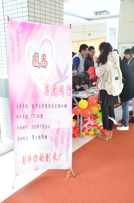 11月26日中午,经济法学院学生会组织部在信教底楼举办了以“感恩,与爱同行”为主题的感恩节活动。