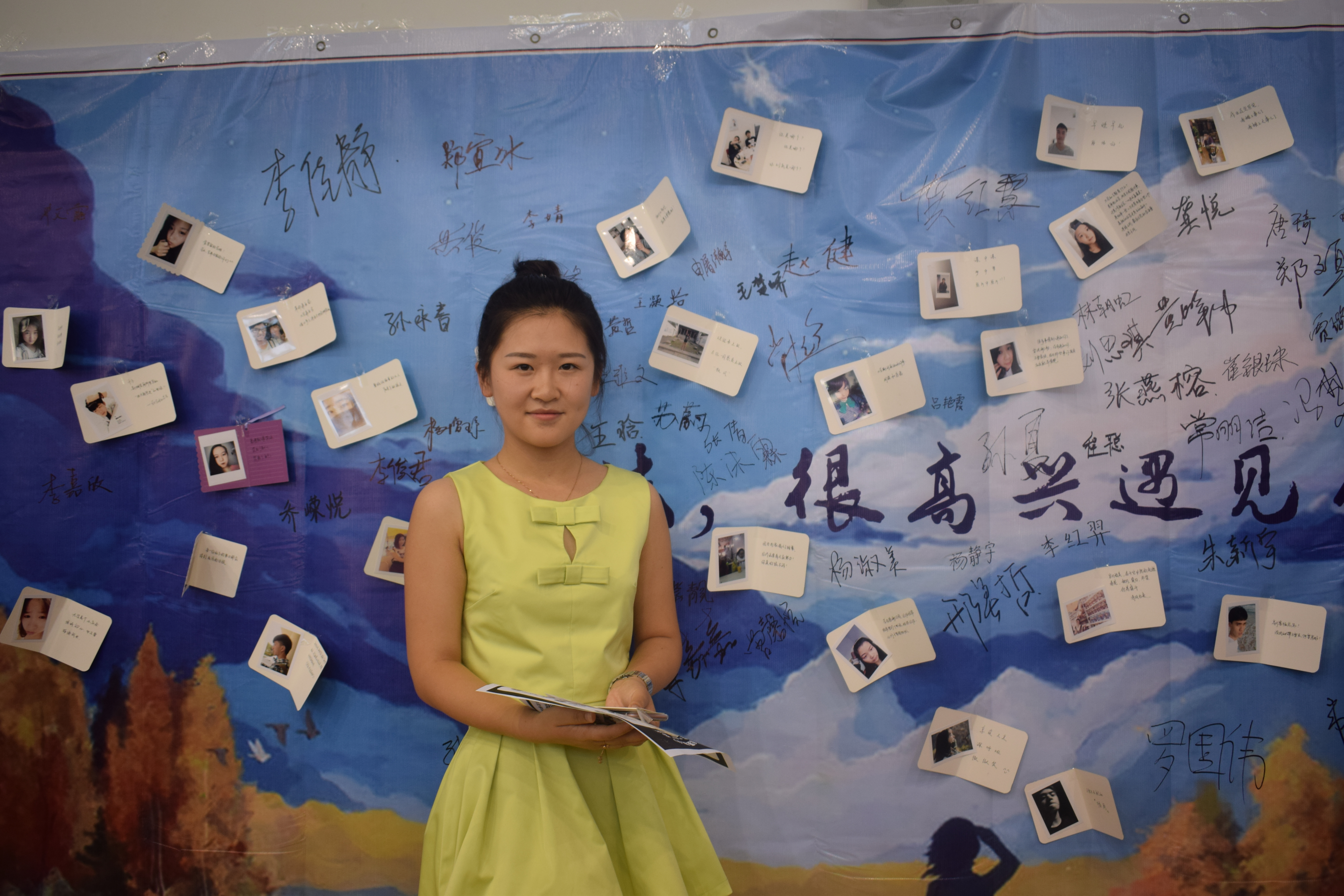迎新特色活动——迎新墙也很吸引大家的眼球,唯美的画风与美好的祝愿充满了学长学姐们对新生的期待。同学们在迎新墙上找到属于自己的照片并且签下姓名,合影留念,这代表了大学生活的开始,代表着在大学这块画布上留下的第一笔色彩。