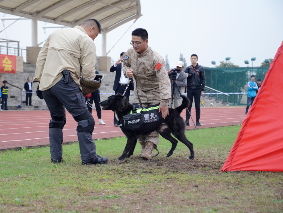 室内宣讲结束后,同学们来到了早已布置好的操场上,在这里开展的是一场模拟抓捕活动。只见在警员的指示下,两条警犬迅速夹击了几名正在接头的“贩毒人员”,仅用几秒的时间便将两名“嫌犯”扑咬在地,随后缉毒犬在训导员的带领下迅速将毒品和枪支找到,而反恐犬更是将躲在掩体后的“贩毒人员”扑咬带出。在同学们的热烈掌声和惊叹声中,此次活动也落下帷幕。