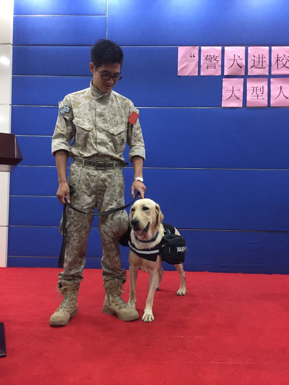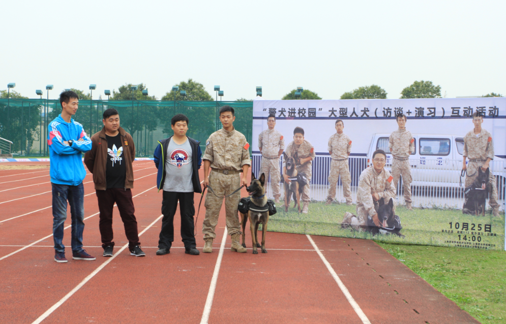在同学们的热切期盼中,宣讲会正式开始,首先由顾队长对警犬的犬种、用途、训练方式进行了讲解。据介绍,警犬分为刑侦搜爆类、反恐防爆类和治安防范类,大多是自幼训练,根据其自身特点被分配到不同的岗位上。随后在主持人与训导员的访谈中同学们不仅了解了一些警犬与训导员之间的温情故事,也得知松江警犬基地为退休警犬修建了养老所,以及训导员可以领养退役警犬等温馨举措。最后由训导员带着他们的伙伴依次上场,为大家讲述每只警犬背后的英雄事迹。在本次展示中,上海市公安局松江分局警犬训练基地带来了不同年龄层、不同品种的警犬,它们中有曾获得功勋奖章的德国牧羊犬阿福,还有可爱温顺的拉布拉多犬可乐,骁勇善战的比利时马犬波比,坚毅强壮的荷兰牧羊犬大白熊。