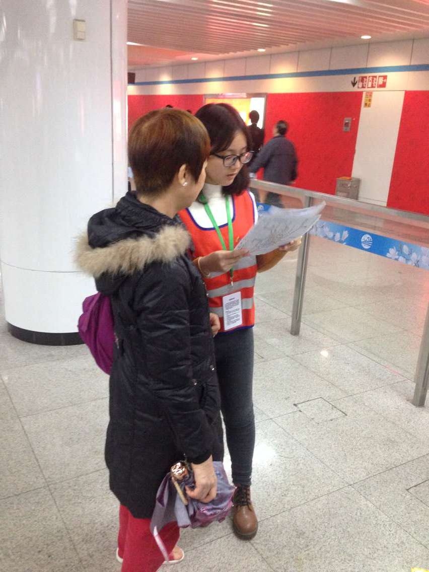 12:50分我们的志愿者准时到达人民广场车控室,地铁站工作人员向我校志愿者介绍了具体事宜并下发志愿者服装、岗位证。随后志愿者们开始了工作。