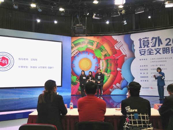 2019年境外安全文明行校园大赛由上海市人民政府外事办公室、上海市教育委员会、上海市文化和旅游局、上海市精神文明建设委员会办公室指导,上海人民广播电台主办,中国银行上海分行冠名,KFM98.1承办,历时二个多月,经过了初赛、复赛,最终有七所高校进入决赛。我校代表队围绕境外民俗风情、文化差异和安全文明行为等知识,通过快问快答,限时问答等比赛方式,在参赛现场尽显上政学子的风采。