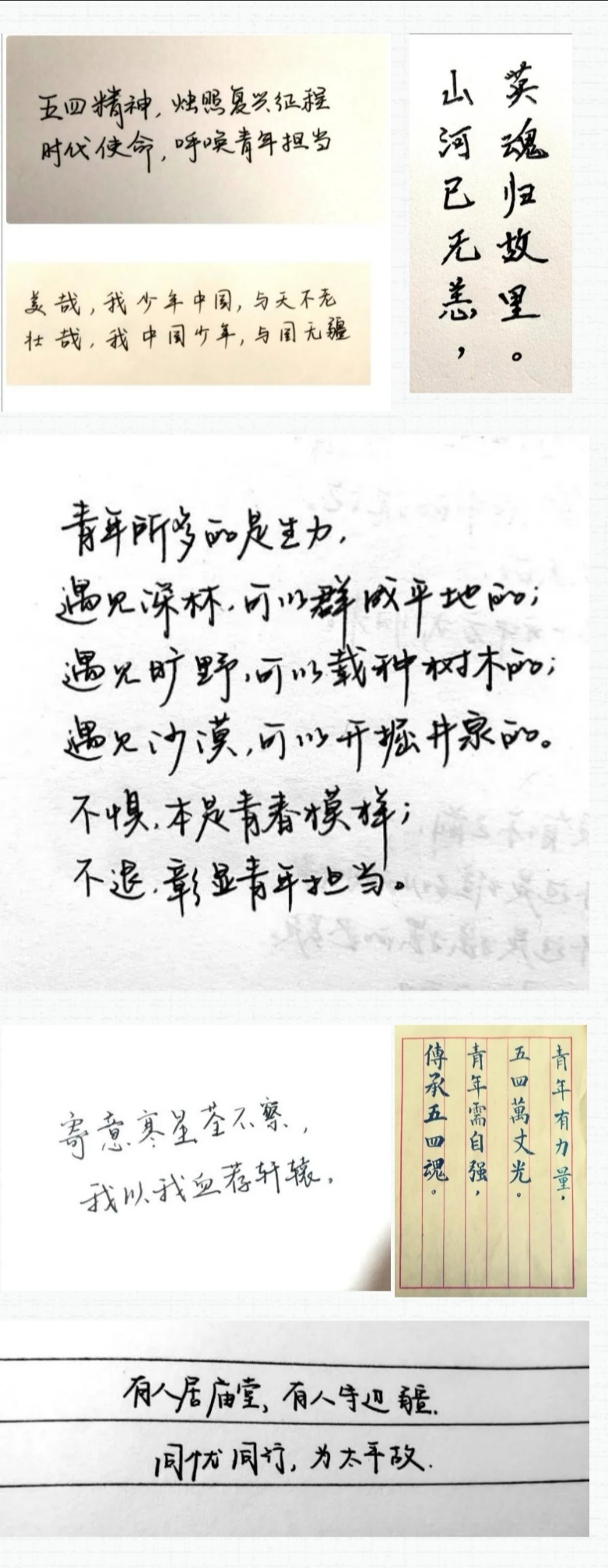 其中较为特色的是“星火终相聚,燃魂照远方”活动。该活动主要分为线上手书和有奖竞答两个环节。线上手书沙龙环节中,同学们阅读、挑选了自己喜欢的有关歌颂祖国、弘扬五四精神的好句、好诗,自己手写的软笔或者硬笔作品拍照上传,形成线上鉴赏沙龙。线上有奖答题赛环节中,同学们对五四青年节的历史背景、文化精神、英雄事迹有了更深刻的认识。
