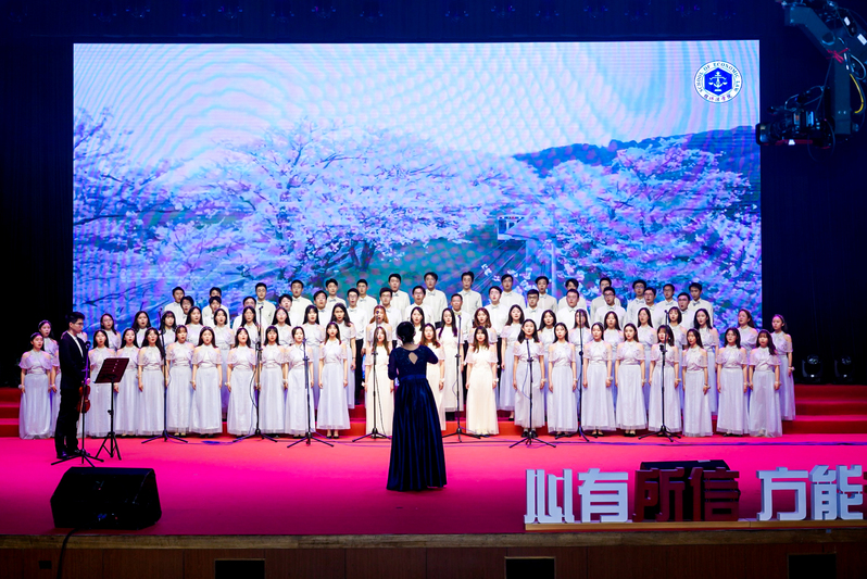 经济法学院压轴出场,由经济法学院党总支书记郭斌,汪雪苑、黄敏艳、熊婷、丁雨凡、蒋海霞老师与同学们共同带来歌曲《梨花又开放》。舒缓的旋律,婉转的歌声,动人的情怀,“摇摇洁白的树枝,花雨满天飞扬”,歌声牵引我们回到魂牵梦萦的故乡。难舍故乡亲,更难舍国家情,歌声中饱含着上政学子的思乡爱国情,触动着心底最柔软的地方,引起在场观众的共鸣。