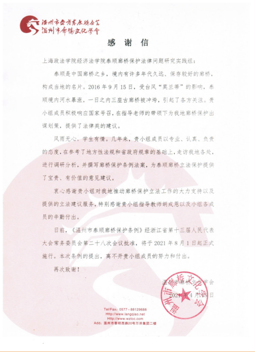 经过初级筛选、展区现场问辩、公开答辩和公共开放环节的激烈角逐,由我院院长胡戎恩、党总支副书记叶卉、团委书记汪雪苑共同指导,王沐涵同学主要负责,尹曦、施戚贝凡、付靖颉参与完成的《从立法层面看我国历史文化遗产的保护传承——基于泰顺县古廊桥保护现状及相关立法建议的调查研究》,从众多参赛作品中脱颖而出,荣获二等奖。该项目以泰顺县古廊桥为出发点,从立法的角度研究历史文化遗产的保护传承,并最终起草《温州市泰顺廊桥保护条例》草案,该条例于今年4月7日获浙江省人大常委会第二十八次会议批准。