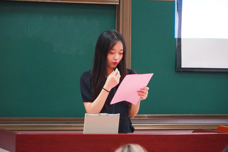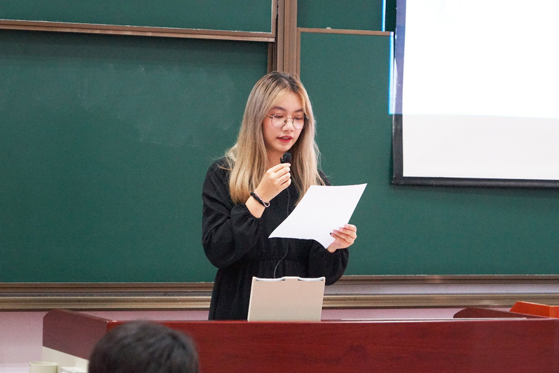 尹曦作上一年度经济法学院团委学生会工作总结报告。她从制度建设、志愿活动、宣传工作、合作能力、文化品位五点,铺陈我院荣誉,汇报我院成就。她提到,团委学生会应当不忘初心、牢记使命,以个人奉献成就团学辉煌,彰显青年的使命感与担当力。