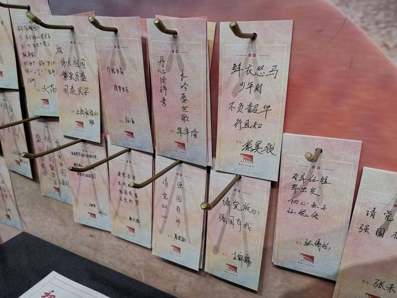 参观结束,支部成员们纷纷写下寄语并将其系在展厅的展览架上。