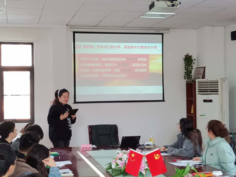 答辩全程共分为个人陈述、抽题答辩及评委提问三个环节。个人陈述环节中,预备党员依次上台回顾了自己的入党历程,就自己在预备期内思想引领、专业学习、社会实践等三方面的情况进行阐述,表现了不忘初心,坚守使命、担当重任的决心。抽题答辩环节聚焦党史、新中国史、改革开放史、社会主义发展史以及习近平总书记系列重要讲话精神等重要理论,着重对预备党员的党史理论学习成果进行考察。在提问环节,评委们就平时表现、党建理论、党务知识、时事政治等多角度进行提问,以此了解预备党员的综合素质和日常表现。