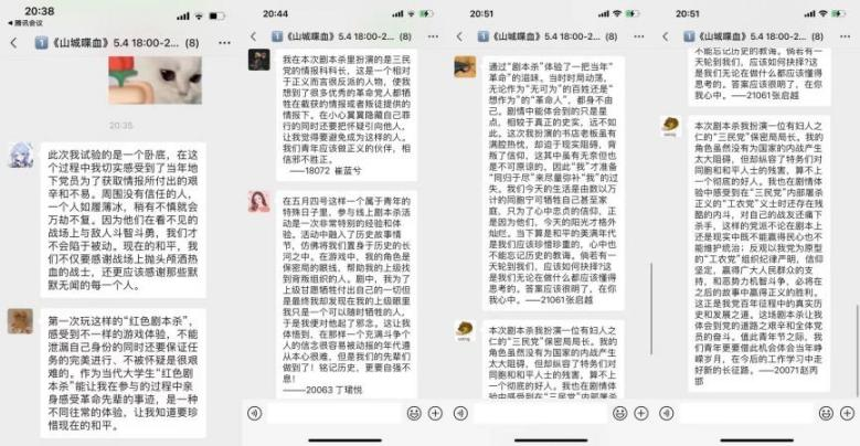 在活动的过程中,随着剧情的推进,向我们铺陈开来的是一段段截然不同的热血人生。有许多同学都抒发了他们各自的感悟:经济法21062的杜佳欣同学觉得,我仿佛真的回到那个战火纷飞的年代,仅靠着一腔热血,我们这群年轻人,去印刷《新青年》,去街头游行,去各地宣传新民主主义。那时候,我们不知道自己的这份努力对中国的胜利有多大意义,也不知道我们要用多少年才能迎来胜利,甚至不确定我们能不能胜利。在牺牲之时,我们所能依赖的只有坚定的信念。“我们一定会获得胜利。”这些故事,其实比我读完历史想象当中更悲壮和伟大的多。剧本的结尾,国际歌响起,不觉已饱含热泪……看来时路方知重任在肩。感谢有这么一群人,不愿独善其身,在黑暗横行的年代里,不问意义,不问将来,毅然投身于最危险也最伟大的事业里去。