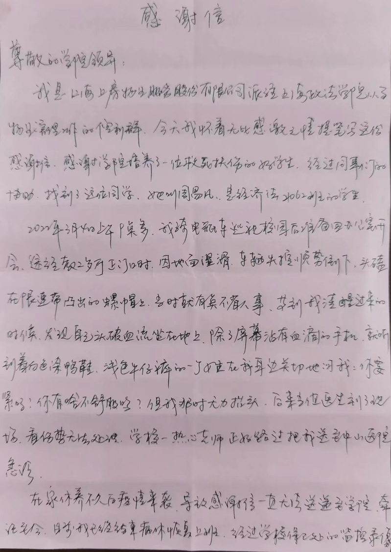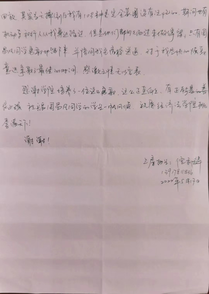 5月17日,经济法学院收到了一封来自上房物业倪利群女士特殊的感谢信,信中表达了对经济法学院21062周易凡同学及时伸出援手的感谢之情以及对周易凡同学和经济法学院的美好祝愿。原本在三月份倪女士就要发出这份感谢信,却被疫情阻挡了脚步,但时间虽逝,真情不减。
