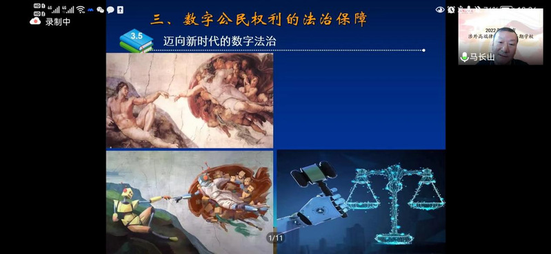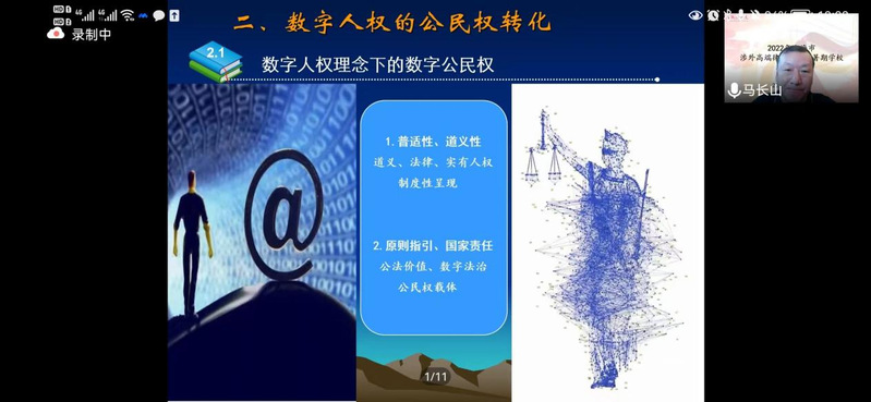 6月30日上午,教育部“长江学者”特聘教授、华东政法大学数字法治研究院院长、博士生导师马长山教授为研究生暑期学校作“从数字人权到数字公民权”专题讲座。图书馆馆长赵俊教授主持讲座。