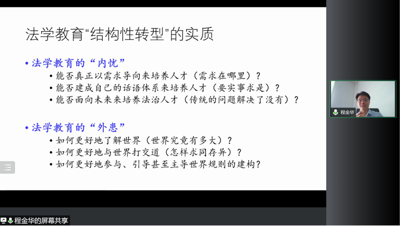 7月4日上午,上海交通大学研究生院副院长、凯原法学院特聘教授、博士生导师,教育部“青年长江学者”,上海交通大学中国法与社会研究院副院长、研究员程金华教授为研究生暑期学校作“‘新文科’和‘双循环’背景下的法学研究生教育”专题讲座。经济法学院商建刚副教授主持讲座。