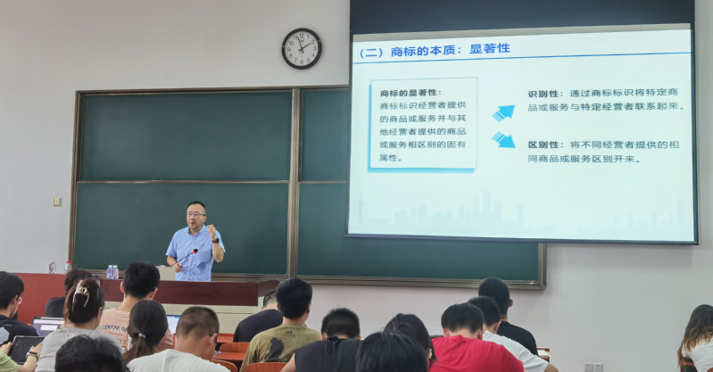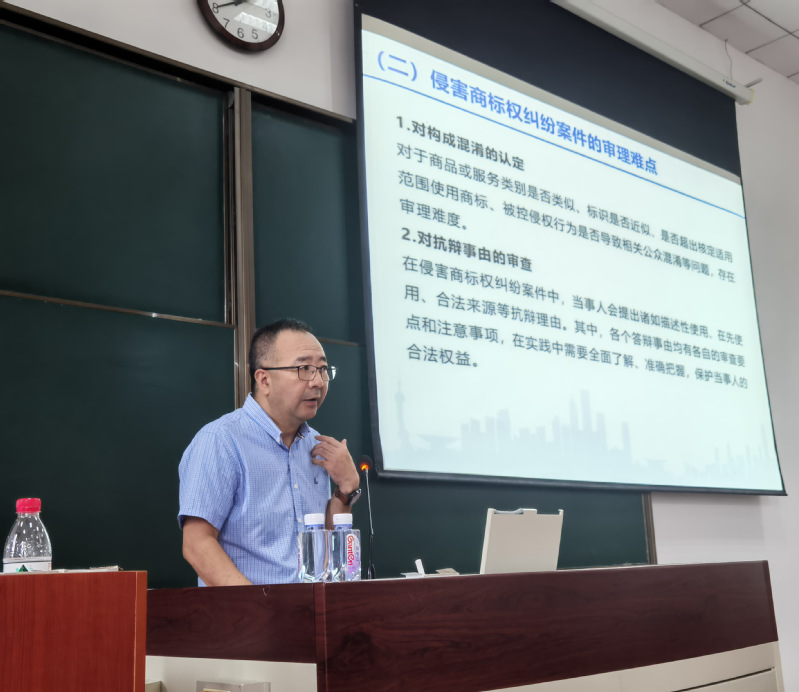 钱光文庭长随后以“侵害商标权纠纷案件的裁判规则与司法实践”为题,从“侵害商标权纠纷案件的总体概况”“商标的本质与商标专用权保护”“侵害商标权行为的构成要件”“侵害商标权纠纷案件中相关问题的认定与裁判规则”四个方面展开授课,深入浅出地呈现了商标权案件纠纷的司法实践全貌和审理难点,拓展了在座师生的商标司法实践视野,凸显了商标研究的核心焦点,衔接了商标基础知识与审判实务的内在关联,其实务授课的知识全面性、内容凝实性、提炼精准性、观点专业性让听众印象深刻,受益匪浅。