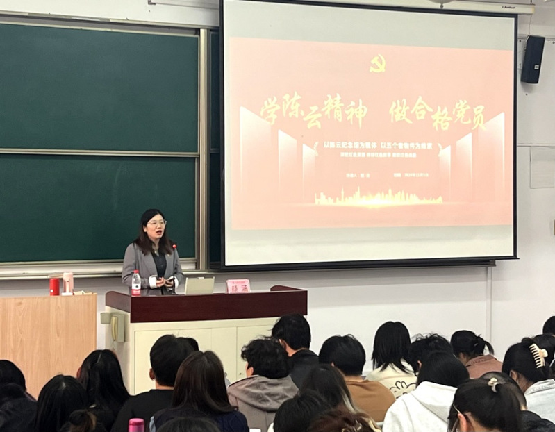 最后,学工部党支部副书记颜涵老师以《学陈云精神做合格党员》为主题进行授课。
