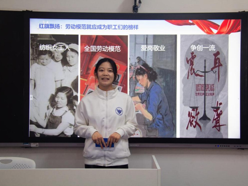 活动伊始,三位青年宣讲人以“一物一故事”形式依次讲述跨时代劳模事迹:余熙借“裔式娟小组的故事”,重现社会主义建设初期纺织女工裔式娟投身工业生产、践行“爱岗敬业”的奋斗历程;徐福一以圆珠笔为引,展现改革开放中“抓斗大王”包起帆发明“单索抓斗”、以“勇于创新”攻克技术难关的革新故事;王凯乐通过“调解手册”,呈现新时代“小巷总理”朱国萍扎根社区三十载、凭“甘于奉献”化解民生难题的基层实践,生动诠释了劳模精神在不同时期的具体内涵。