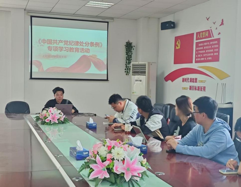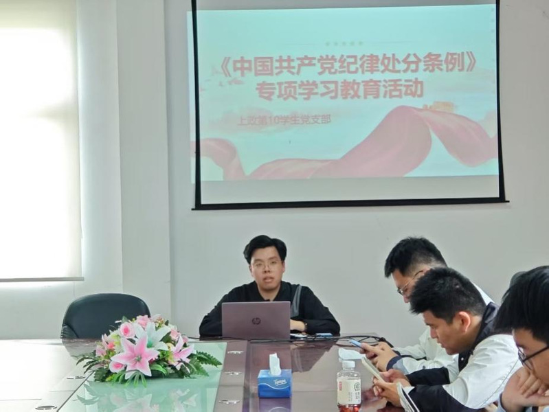 为进一步巩固拓展党纪学习教育成果,推动深入贯彻中央八项规定精神学习教育走深走实,2025年4月30日中午,上政第10学生党支部于B1-201教室开展《中国共产党章程》与《中国共产党纪律处分条例》专项学习和集中研讨。此次集中学习由党支部书记周嘉晟主持,支部全体党员参会,通过“领学+研讨”的立体化学习模式,引导党员同志深学细悟党章精髓,准确把握《条例》要求,切实增强规则意识和底线思维。