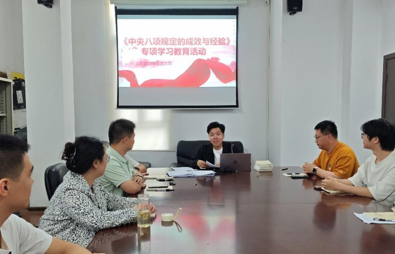 为推进深入贯彻中央八项规定精神学习教育走深走实,加强党支部五色理论学习课堂建设,2025年5月27日下午,上政第10学生党支部在B3-110开展党的十八大以来深入贯彻中央八项规定精神的成效与经验集中学习研讨会。会议由党支部书记周嘉晟主持,支部全体党员参会。