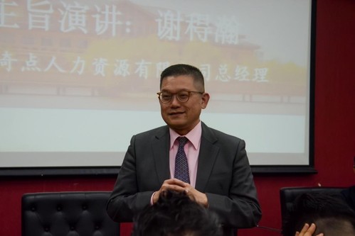 聘任仪式后,第四次实务导师论坛正式开始。上海奇点人力资源有限公司总经理谢䅞瀚发表了主旨演讲。他首先结合个人在创新与创业领域的经历,向同学们阐述了创业的本质在于解决现实问题,并强调了选择正确方向、培养观察力、保持好奇心的重要性。其后,进一步从数据、算法和算力三个维度深入剖析了“拥有AI与缺乏AI截然不同”的观点,并倡导同学们善于运用人工智能,巧妙利用AI技术以增强自身的各项能力。他援引历史上不同时期青年改变世界的案例,强调了“世界属于年轻人”的理念,并激励同学们勇于尝试、把握机遇,积极投身于创新与创业的浪潮中。