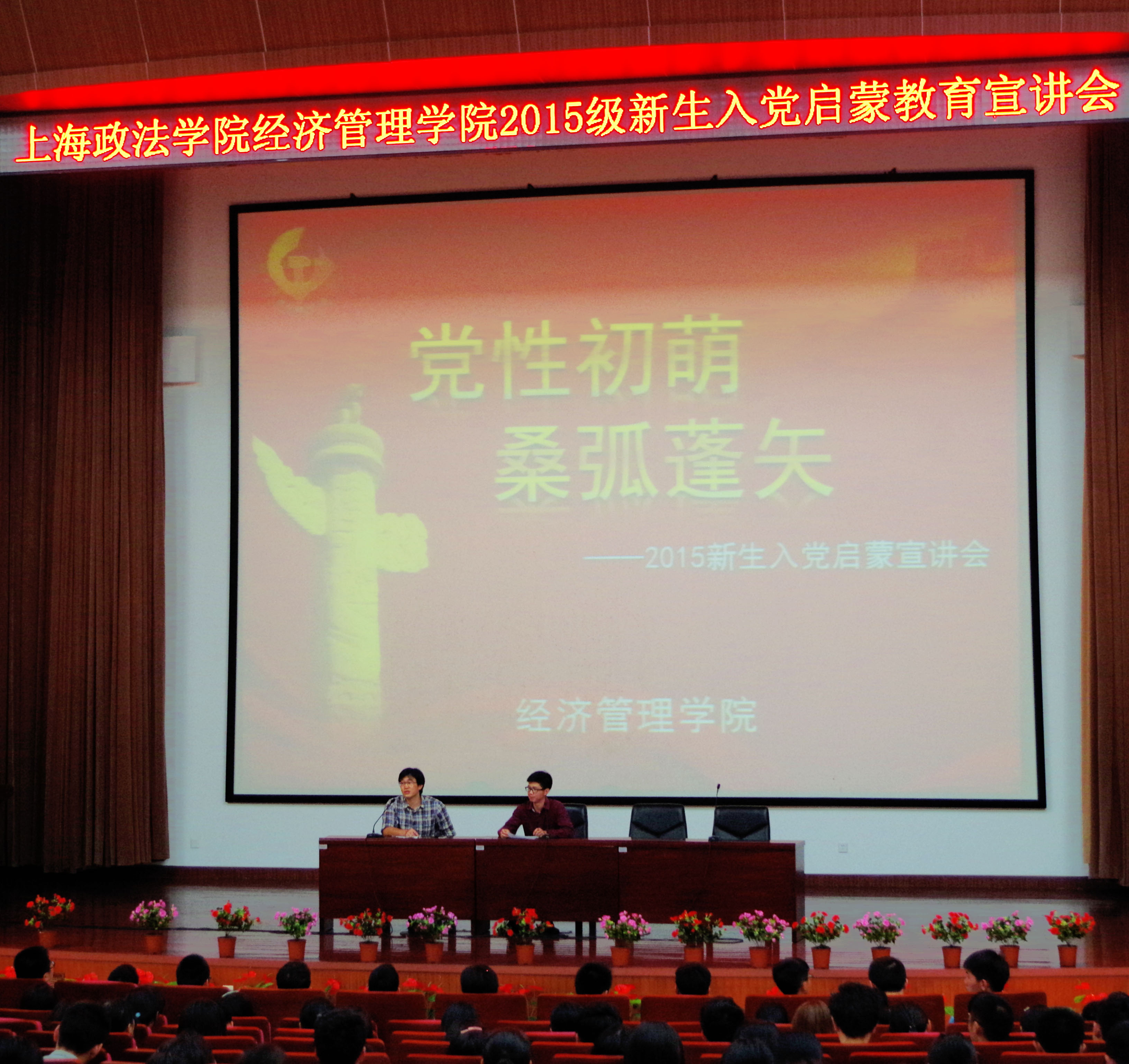 2015年9月29日星期二13:00整,经济管理学院学生党支部新生入党启蒙教育在天马讲堂召开。本次会议由经济管理学院第一学生党支部督导员闫铁钊老师主持,出席老师与领导有:校党委组织部老师胡爱军、经济管理学院党总支副书记江晨、经济管理学院第二学生党支部督导员周占军老师。