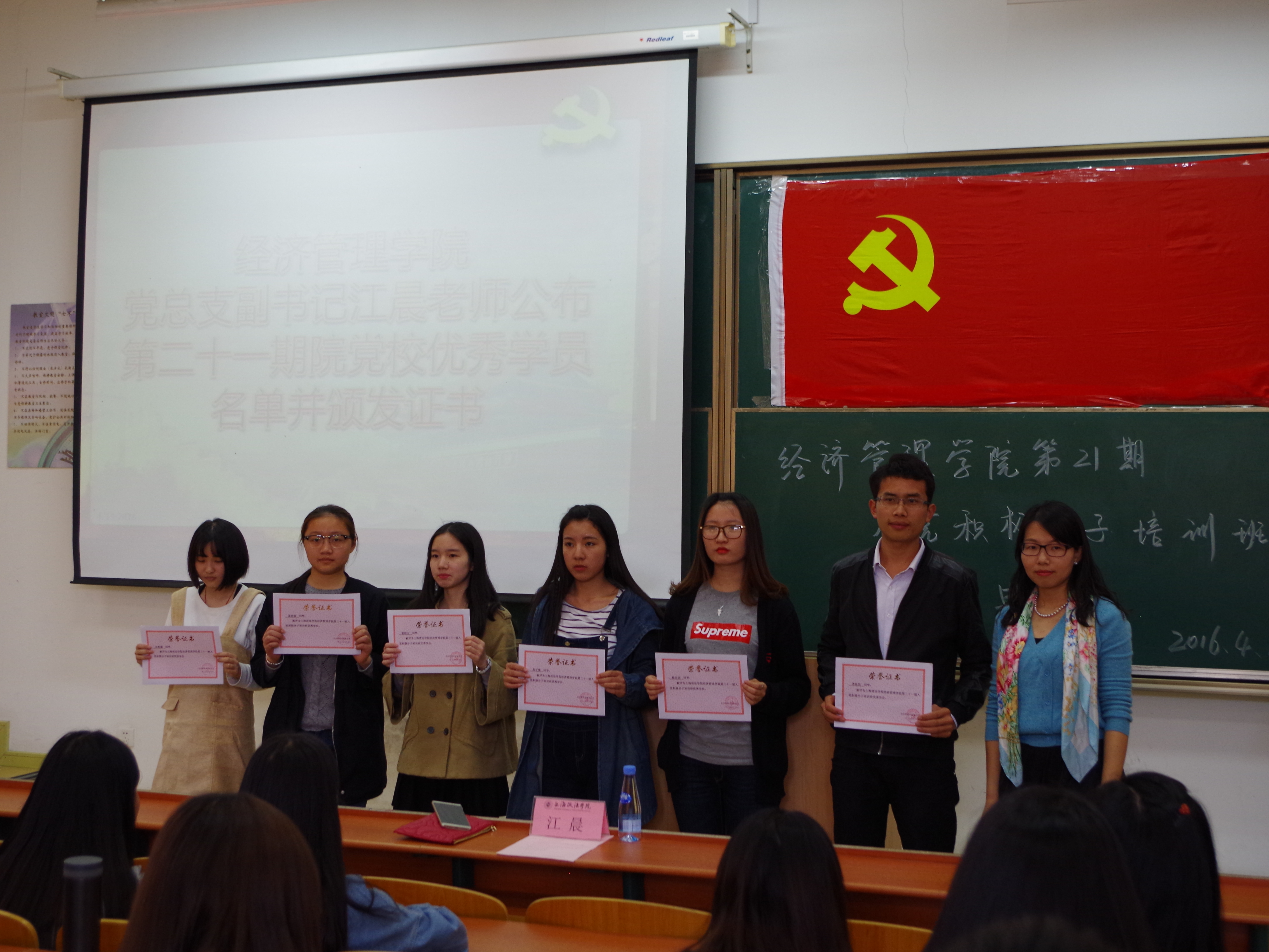 2016年4月19日下午1:00整,新利18官方客服经济管理学院第二十一期入党积极分子培训班结业典礼在A8-101教室召开。党总支副书记江晨老师出席了本次典礼。
