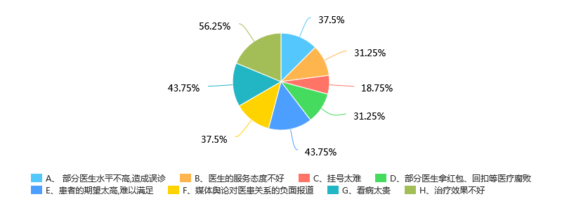 根据调查与采访结果,大约56%的人认为当前的医患关系仍较为紧张,但问起对看病不满意的原因,有81%左右的患者认为当前医院存在乱开药乱检查的情况,对此,小组成员表示在去医院看病时也深有体会。在看病时大多数患者对医生的信任程度都持保留态度,可见由于医患关系的日益紧张,患者对医生信任程度有逐渐下降的趋势。在医生采访时,医生对当前的状况也很无奈,医生对自己人身安全无法保障感到无助,认为仍需要社会和国家的努力。
