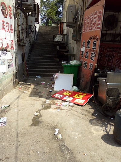 上午九时许,小组成员们来到阜阳一中对面的小吃街调查,在摊位不集中的地方整体比较干净,道路上也没有什么比较明显的垃圾。往深处走,就发现在一些小吃摊集中的大棚旁边有较多垃圾,大多是一些食品的包装和塑料袋。在一个店铺旁边,又发现了垃圾的集中堆放点,尽管有垃圾桶,但是已经装满,却无人及时清理,垃圾桶的周围更是肆意堆放着很多垃圾,在高温的天气中散发着难闻的气味。上午的人流量不多,在中午饭点的时候成员们又回到了小吃街,发现原来还算干净的街道到处都散落着垃圾,更不用提摊位集中区,小吃街的卫生环境之差可见一斑。