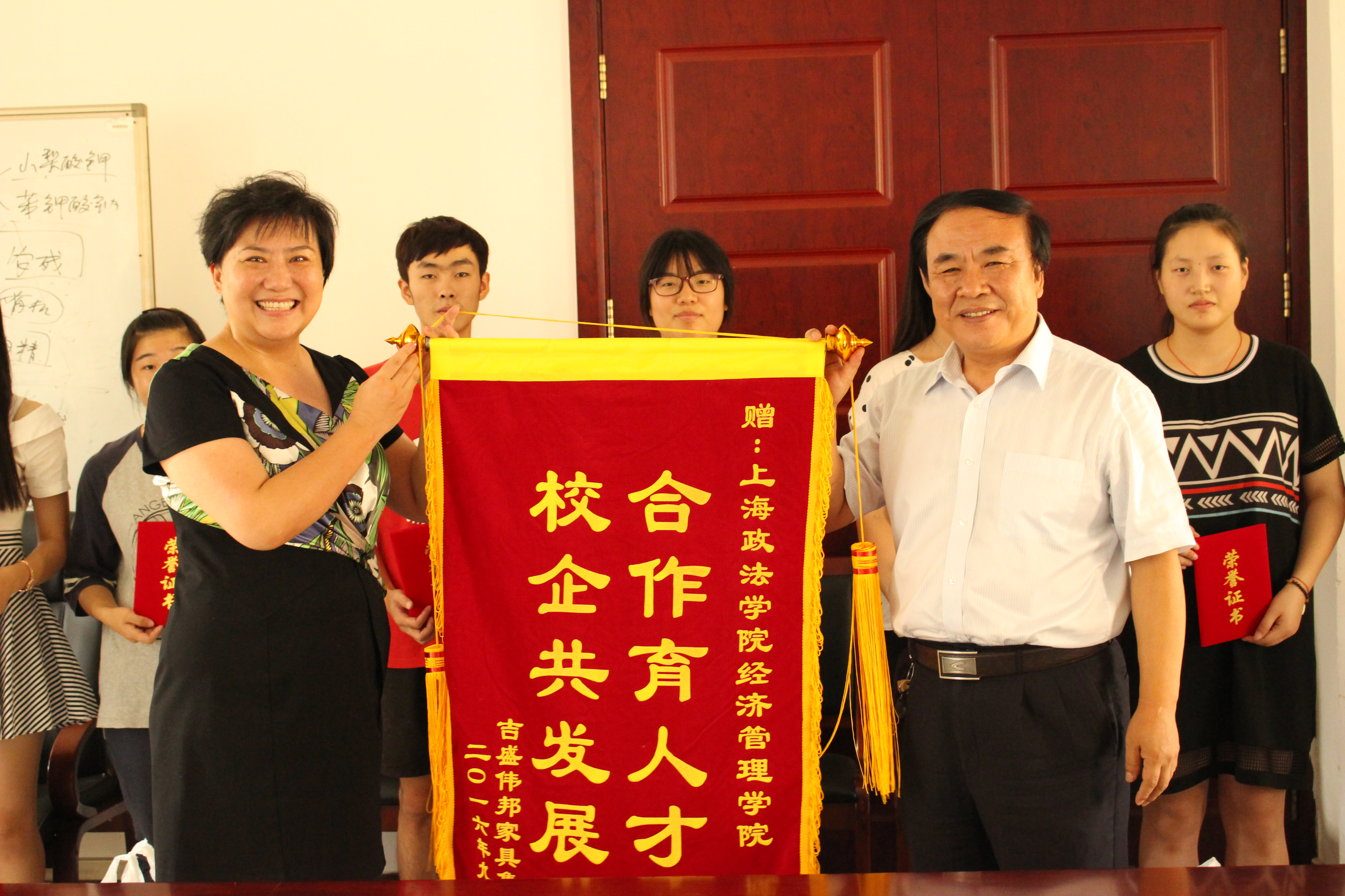 首先,王院长亲自为获优秀志愿者奖的13名学生颁奖,并鼓励他们继续努力,再创佳绩。庄总代表吉盛伟邦家具集团赠予新利18官方客服经济管理学院活动锦旗,还为学生们准备了纪念品,以彰经管学子们的出彩工作,庄总提到,经管学子7月初报名家具展会志愿者后,9月5号115名PT全部到位,虽然学校还没开学,他们全体提前返校准时进入工作岗位,这种诚信的精神非常可贵;他们顶着高温在展会中的兢兢业业、超额完成任务,展会各部门都给予了充分肯定,期待未来校企继续合作发展,培育人才。本次社会实践活动授旗暨颁奖仪式的圆满结束,鼓舞了学生们的士气,也坚定了学生们再接再厉、继往开来的信心。吉盛伟邦家具集团是经管学院长久合作的教学实践单位,合作紧密、共赢发展,此次国际家具展志愿者活动已经开展第三年,并将进一步深入合作。(撰稿:陈靖宇 摄影:蒋露)