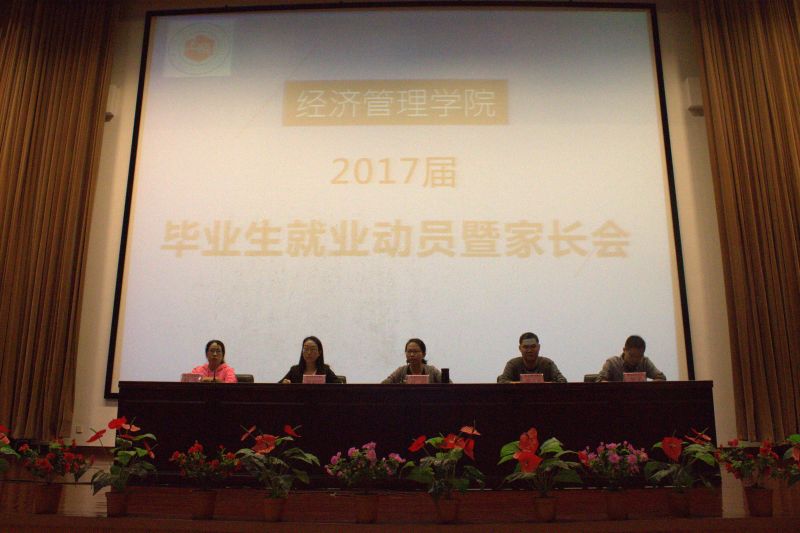 为了保证学生和家长对当前就业形势和就业政策有进一步的了解,抓住就业机会,做出切实有效的行动和对个人未来发展的正确定位,共建学生未来的美好蓝图,经济管理学院于10月15日上午在天马讲堂召开2017届毕业生家长会暨就业动员会,招生与就业办副主任徐丽红,经管学院总支副书记江晨,毕业班辅导员周占军、郭平、刘雪出席会议,会议由江晨主持。