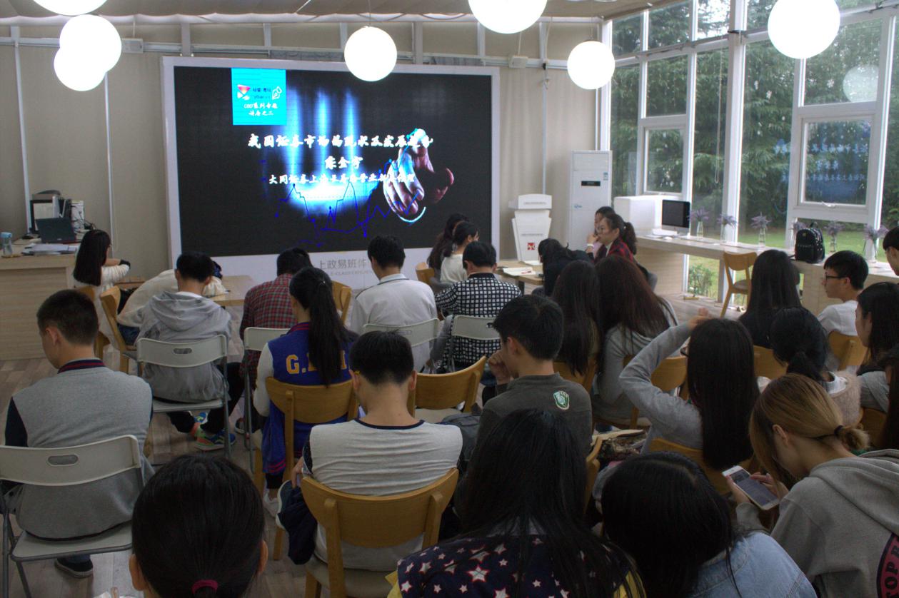 陈总首先就我国证券市场的成就与问题两方面,浅谈了自己对证券市场的认识,生动形象地给在场同学勾画出了我国证券市场的发展历程及其在资本配置方面的积极作用;其次,陈总以一个上市公司股票的涨跌为切入点,给大家层层剖析了2015年中国股灾的成因,同时给出了一些具有建设意义的对策。“水无常势,股无常态”陈金宇总经理如是说,陈总依据自己多年的从业经验并结合一个个实例具体的分析了股市的风险性。陈总指出对于证券投资一定要保持清醒的头脑,对资金进行合理的配置,避免教条式的思维和鸵鸟式的态度;最后,陈总简要分析了我国证券市场的预期发展走向,并提醒同学们智慧、理智、冷静、汗水对成功必不可少。