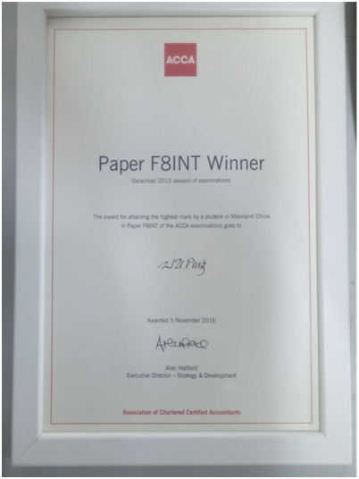 ACCA全称Association of Chartered Certified Accountants(特许公认会计师公会),国内习惯称之为国际注册会计师,其会员遍布全球,是目前为止国际上认可度最高的职业会计师协会之一。ACCA共有14门考试,每一门对于没接触过会计知识的吴平同学来说难度都非常大,能取得F8大陆第一高分更是极为不易。吴平同学的ACCA授课老师对于其赞不绝口,并亲自为其颁发证书和奖金。而吴平对于自己取得大陆第一高分的成绩笑谈是“实力+运气”的结果,离不开自己的努力,更离不开学院的培养。吴平同学建议大家不要以高分为终极目的,而是要发自内心地思考为什么要学,为什么而学,端正自己的态度。