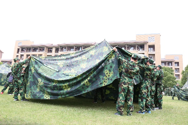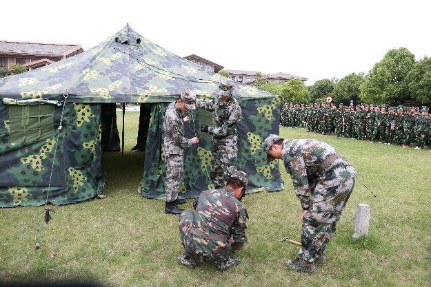 傍晚,学员们在图书馆前的大草坪上集合,经过教官们的示范演练和悉心指导后,16排至19排的同学们展开了搭帐篷的比赛。大家分工明确,团结合作,在大家整齐而热烈的加油声中,成功搭建起属于自己排的帐篷营地。教官笑着鼓励大家:“北上广的房子很贵,但是我们不怕,因为我们有建设自己家园的能力!”