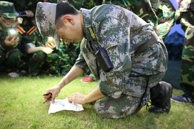 随后,教官们为大家讲解了如何利用工具在野外生火,同学们纷纷围成一个圈,主动用手电筒为教官照明。在火花点燃纸巾的那一刹那,同学们欣喜地叫出了声,是激动、是喜悦,点点星火的燃烧,如同他们跃跃欲试的心。