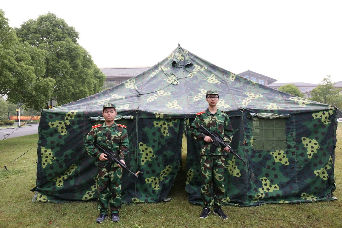 最后一项任务是值岗站哨,教官们为大家详细讲解了营地哨岗中固定哨和流动哨的区别和作用,并带来了*帮助同学真切地感受军事生活。同学们背起枪,站在自己亲手搭建的帐篷外守护他们的家园。