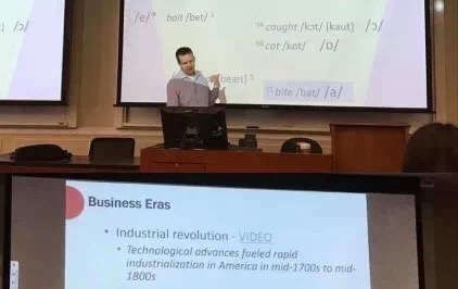 语言文化课的老师Prof. Jon Smith是唯一每天都给我们上课的老师,他用有趣的视频和游戏让我们了解中美语言和文化上的一些差异,经常会让我们分小组一起讨论互动。这样的课堂模式,让我们渐渐地更加融入课堂,并可以轻松地感受和理解到到各方面的差异。